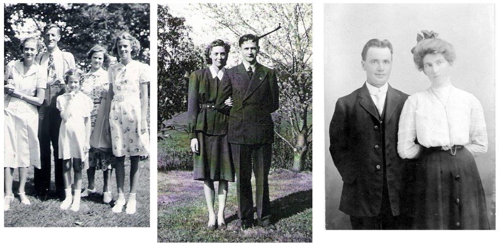 Photos: (L) Mabel & Family; (M) Glen & Mabel; (R) Glen's parents